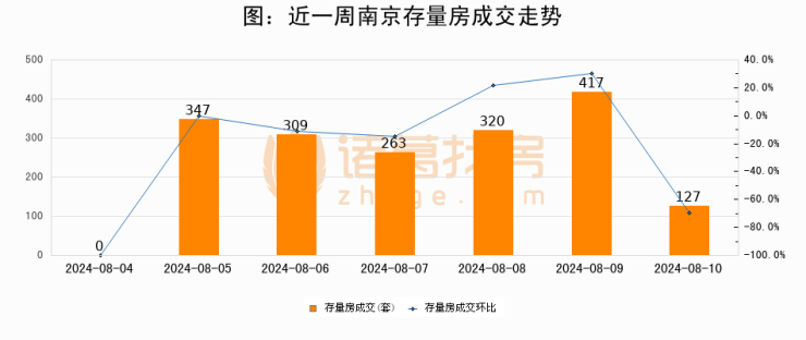 从存量房来看,2024年08月10日南京存量房单日成交127套,比昨日减少290套,环比下降69.5%。从近一周存量房成交来看,南京存量房日均成交套数为254套,08月10日单日成交127套,低于近一周平均水平50%。