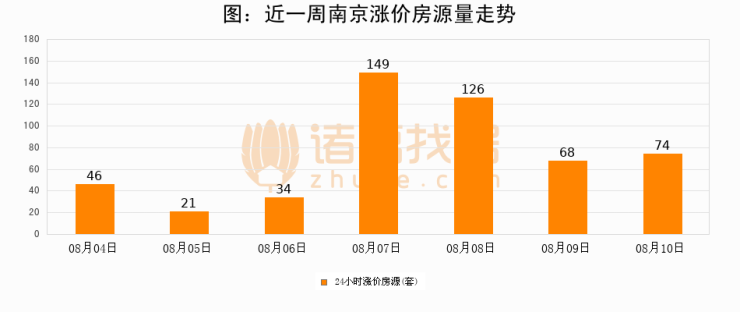 根据诸葛找房数据显示,南京24小时涨价房源量为74套,较08月09日增加6套,环比上涨8.8%。与此同时,涨价房源占比小幅扩大,业主信心有所提升。