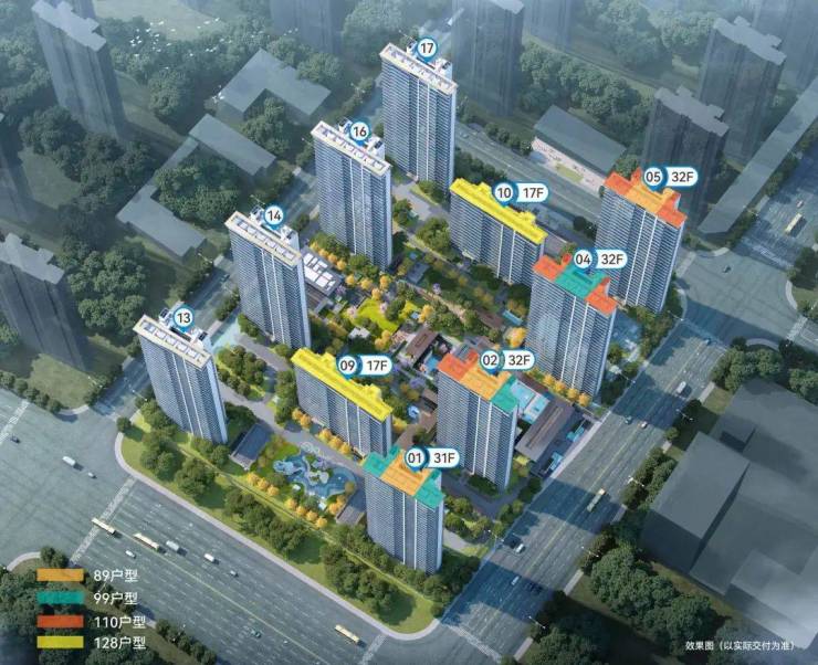 产品上,项目规划打造10栋17-32F住宅,户型建面约89-128㎡。