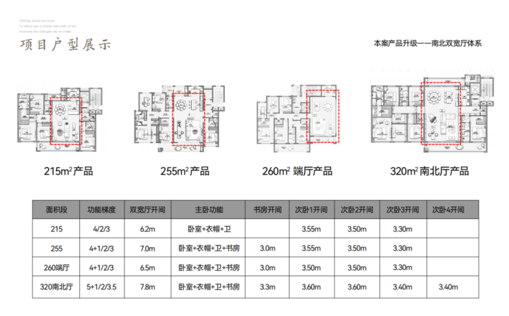 项目住宅部分规划22栋4-5F洋房,户型面积215、255、260、320㎡,全系LDKB一体化空间设计,4房2厅3卫起步。