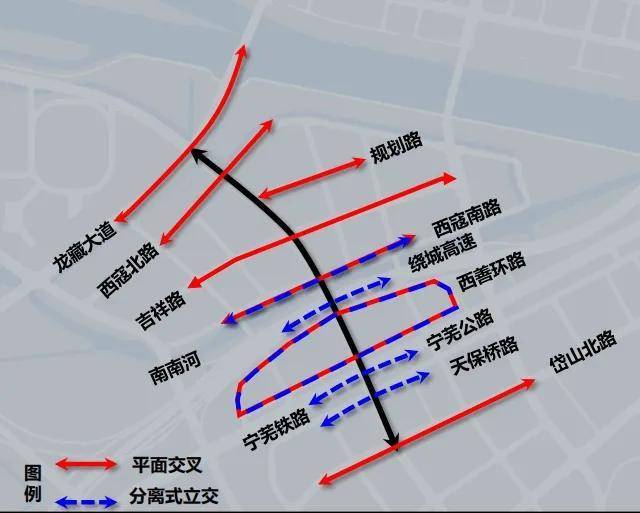 工程将向北依次跨越天保桥路、宁芜铁路、宁芜公路后,与西善环南路、西善环北路上层道路平交,再向北跨越绕城公路、南南河后与西寇南路上层道路、吉祥路、规划路、西寇北路平交,最后接龙藏大道。