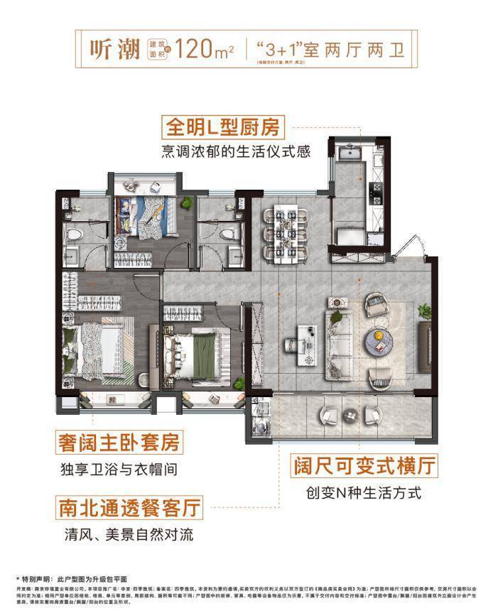 建面约120㎡3+1房两卫,可变式横竖厅灵动自拓,独立餐客厅各自享受南北采光,真正南北通透。卧室皆带飘窗,实际使用面积更大。