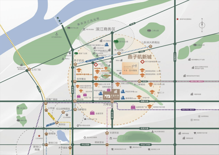 约21万方万象系商业(在建)与招商花园城一街相望,更兼万谷慧生活广场、燕子矶滨江商务区(在建)等,南京排名前列高端会员店盒马X会员店强势入驻;汇集南师附小、南师附中、泰晤士国际学校等44所优质学府;