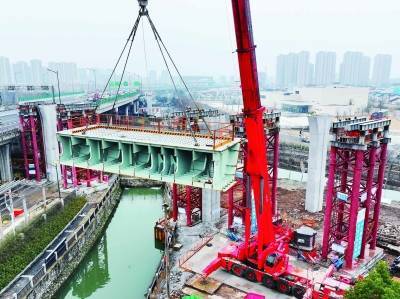 建宁西路过江通道江北连接线首节钢箱梁完成吊装