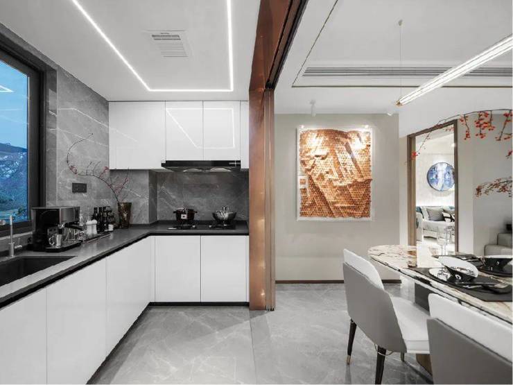 厨房定制上轨道移门,配置金属门框+玻璃移门,不仅颜值在线,后期打扫也更为便利。厨房油烟机、灶具、洗碗机以及燃气壁挂炉均采用博世或同档次品牌。