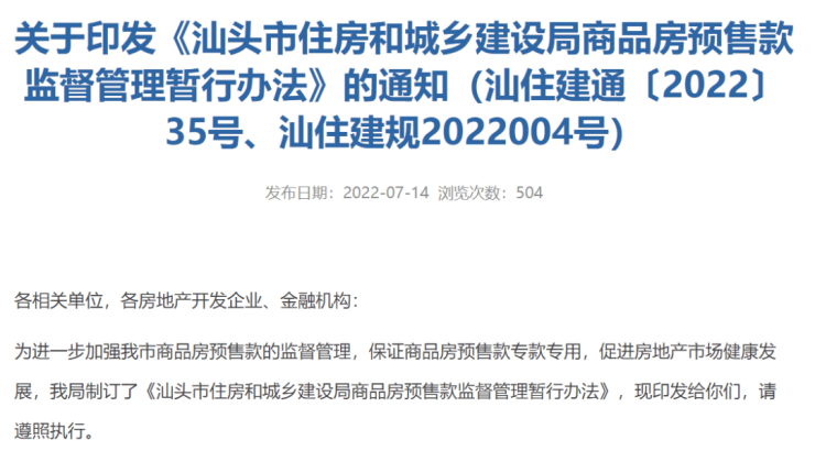 此前的7月11日和12日,深圳龙岗和汕头也分别分发文,进一步加强对商品房预售资金监管、以及房地产项目全周期监管。