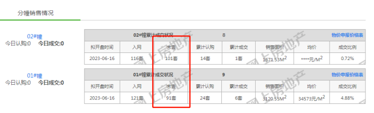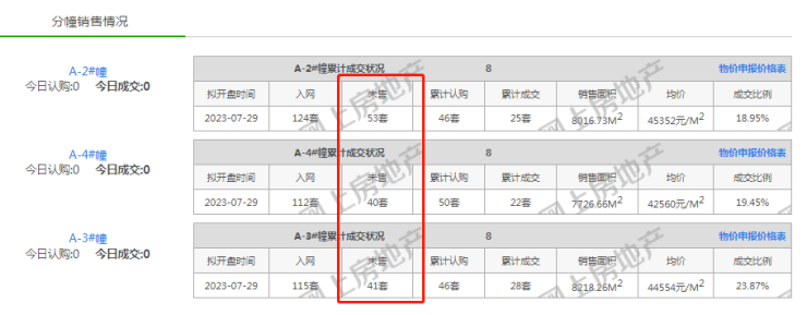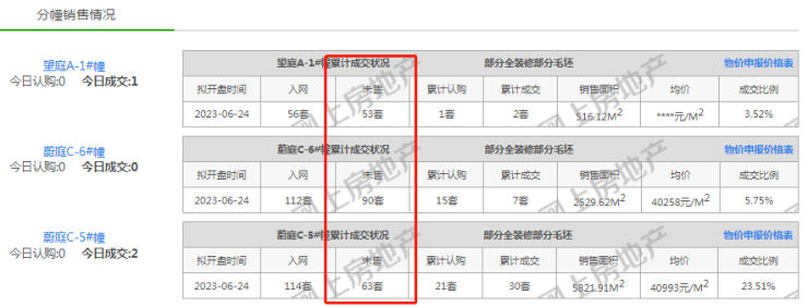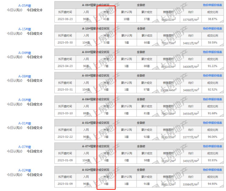 目前从1月首开到4月开盘的6栋楼基本已经去化的差不多了,只剩个位数的房源。5月和6月加推的两栋楼也去化了6-7成左右。
