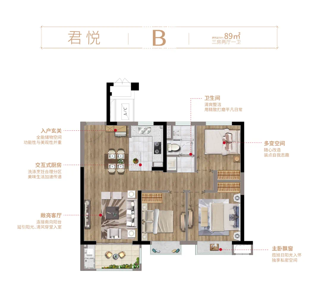 目前已经公开面积约89㎡、102㎡两套样板间,其中建面约89㎡3房2厅1卫的开放式厨房以及建面约102㎡的南向大开间宽进深阳台都非常吸睛。