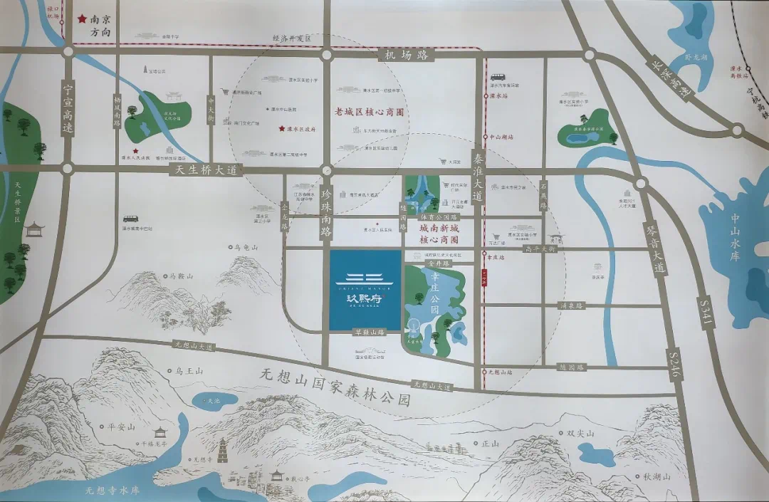 城南片区已经成功晋阶为溧水的新富人区。环境优美,无想山属于溧水典型的不可再生资源,同时片区内还有无想水镇、国家极限运动训练基地(馆)以及万达广场等,S7宁溧线中山湖、幸庄和无想山三个站点均位于城南,片区内多以自住为主。