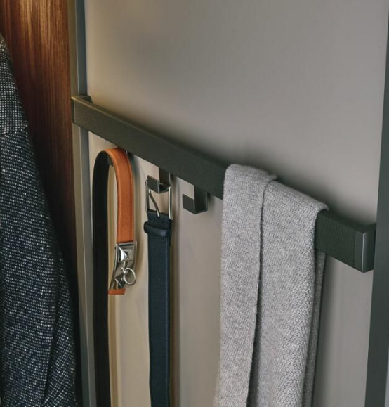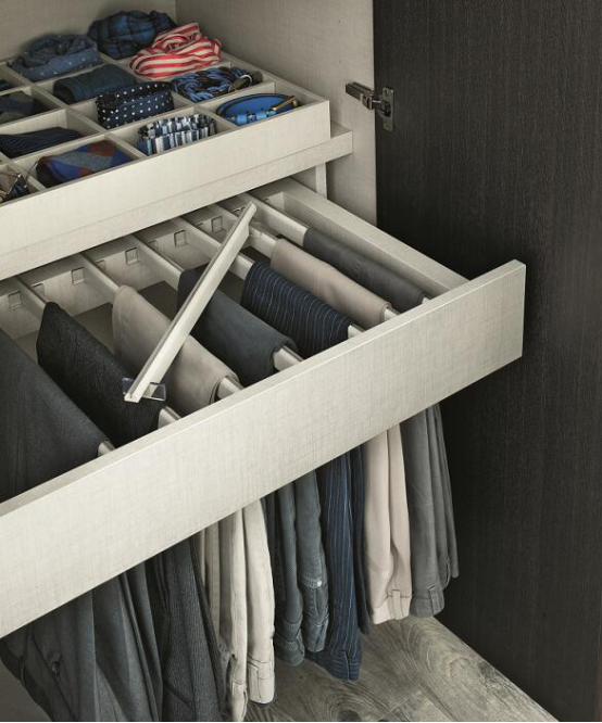 像是一些裤子之类的衣物是可以叠放起来的,有一些面料讲究的避免出现褶皱可以设计一个专门挂裤子的裤架。不会出现折叠导致的褶皱,找衣服的时候也很方便。还有一些领带袜子都可以放在一各自里面分类摆放。