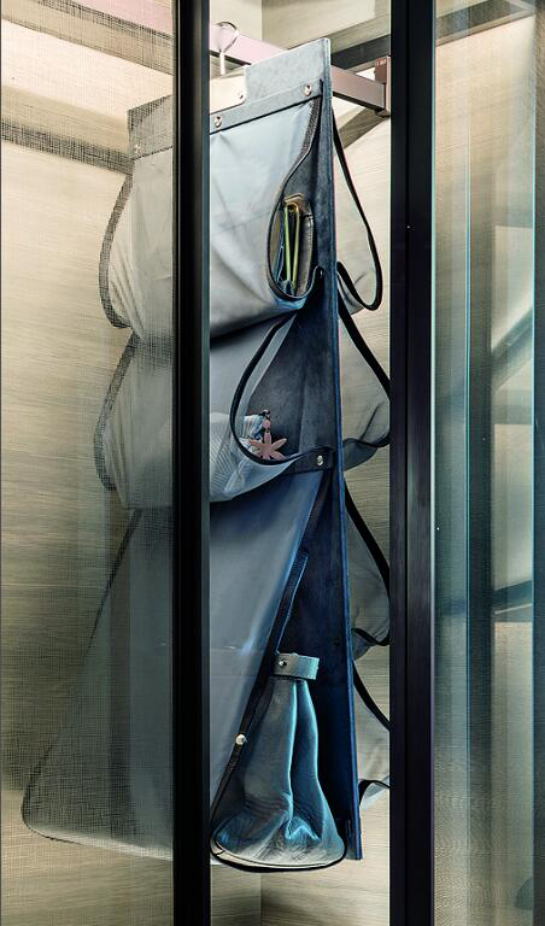 首先看你的生活习惯,你大衣柜一般都放什么东西,怎么放?像是一些冬季穿的棉衣棉服,外套大衣这种衣物是需要挂起来的,那么在一个内部布局时候要设计一个挂衣区,挂衣的横杆不能太高,不然会拿取衣物不方便,尤其是一些老人。也可以安装一个下拉式的挂衣杆,方便老人孩子拿取衣物,也是很方便的设计。