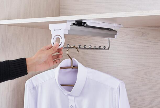 如果衣柜深度比较深也可以选用可以抽拉的挂衣杆悬挂。方便拿取衣物。