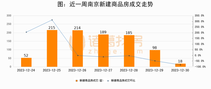 根据南京市住房保障和房产局数据显示,2023年12月30日南京新建商品房成交18套,较昨日减少80套,环比下降81.6%