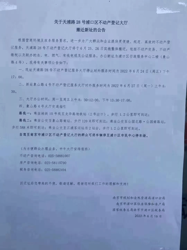 较新消息,6月25日起,天浦路28号浦口区不动产登记大厅将整体搬迁至浦口区行政服务中心二楼。