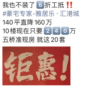 五桥的雅居乐汇港城6折卖房,最高优惠160万,折合单价仅1.7万/㎡!项目推出20套特价房,户型建面约141㎡大平层,总价仅240万,带中央空调、地暖和新风!据悉优惠开始当天,项目就卖出了约10套房。