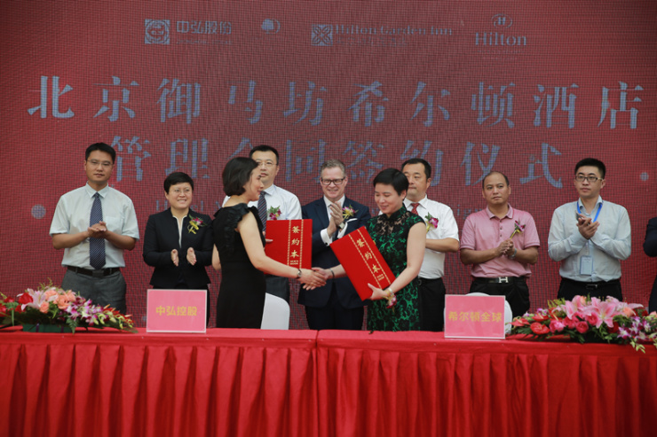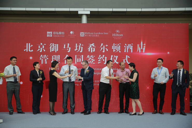 2016年8月24日,“北京御马坊希尔顿酒店管理合同签约仪式”在新奇世界御马坊展示中心隆重举行,平谷区政府领导嘉宾到场祝贺。在现场数十家媒体的见证下,中弘控股股份有限公司(以下简称“中弘股份”)与希尔顿酒店集团将携手打造京城文化旅游地产的“新标杆”。