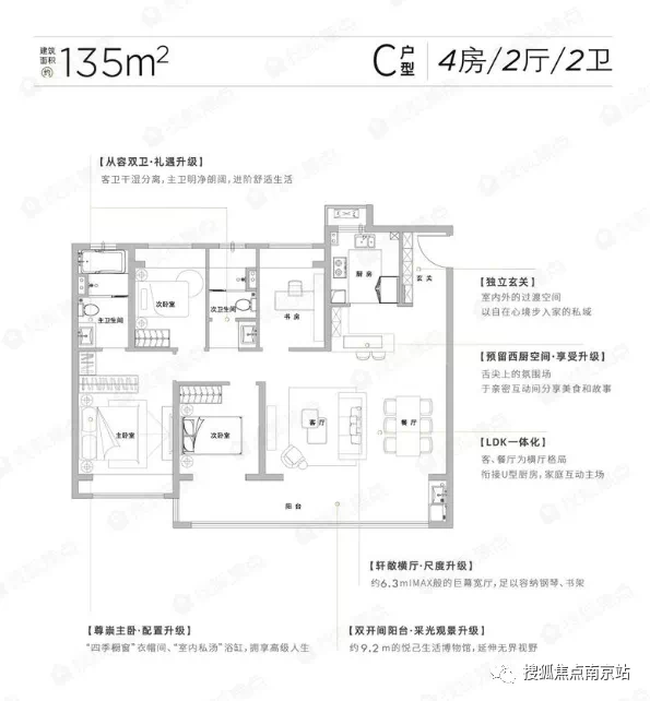 “产品最引人瞩目的亮点之一,是打破市场传统户型的固有思维。比如135m²大四房户型,拥有约6.3米巨幕横厅,约9.2米双开间阳台,主卧含衣帽间+主卫四件套顶配。还专门预留中西双厨空间,对标河西大平层豪宅。”有业内人士透露。