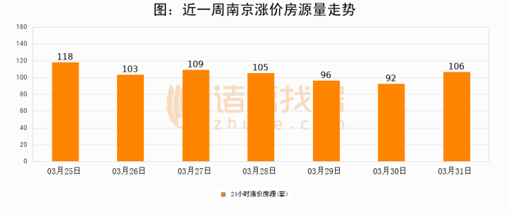 根据诸葛找房数据显示,南京24小时涨价房源量为106套,较03月30日增加14套,环比上涨15.2%。与此同时,涨价房源占比小幅扩大,业主信心有所提升。