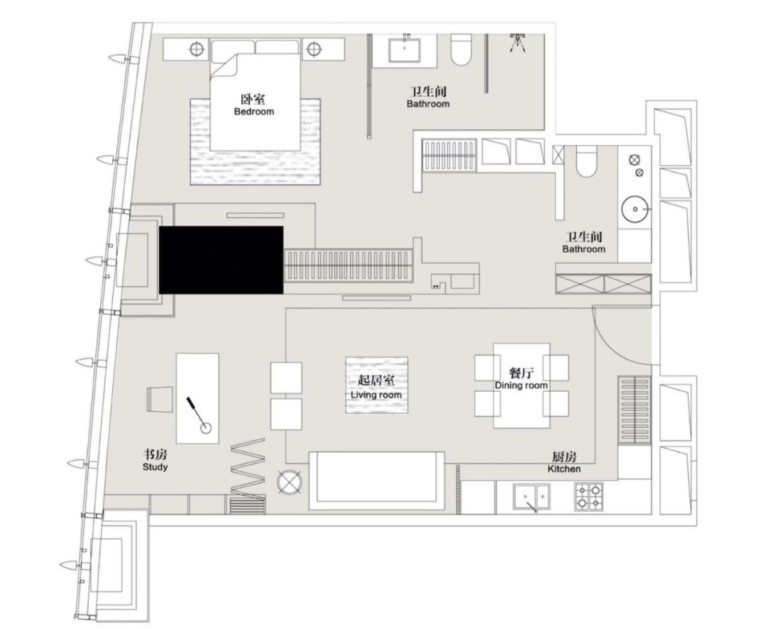 以这套中区的户型为例,分为起居室和卧室两开间。整体强调动静分区,并配备收纳空间,让长住不感觉空间狭隘。