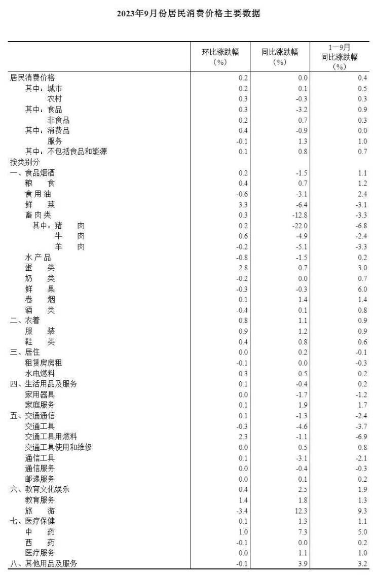 2023年9月份,全国居民消费价格同比持平。其中,城市上涨0.1%,农村下降0.3%;食品价格下降3.2%,非食品价格上涨0.7%;消费品价格下降0.9%,服务价格上涨1.3%。1—9月平均,全国居民消费价格比上年同期上涨0.4%。