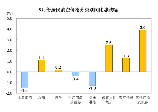 9月份,全国居民消费价格环比上涨0.2%。其中,城市上涨0.2%,农村上涨0.3%;食品价格上涨0.3%,非食品价格上涨0.2%;消费品价格上涨0.4%,服务价格下降0.1%。
