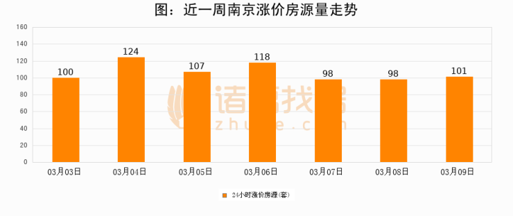 根据诸葛找房数据显示,南京24小时涨价房源量为101套,较03月08日增加3套,环比上涨3.1%。与此同时,涨价房源占比小幅扩大,业主信心有所提升。