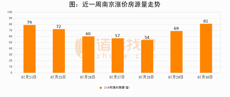 根据诸葛找房数据显示,南京24小时涨价房源量为81套,较07月29日增加12套,环比上涨17.4%。与此同时,涨价房源占比小幅扩大,业主信心有所提升。