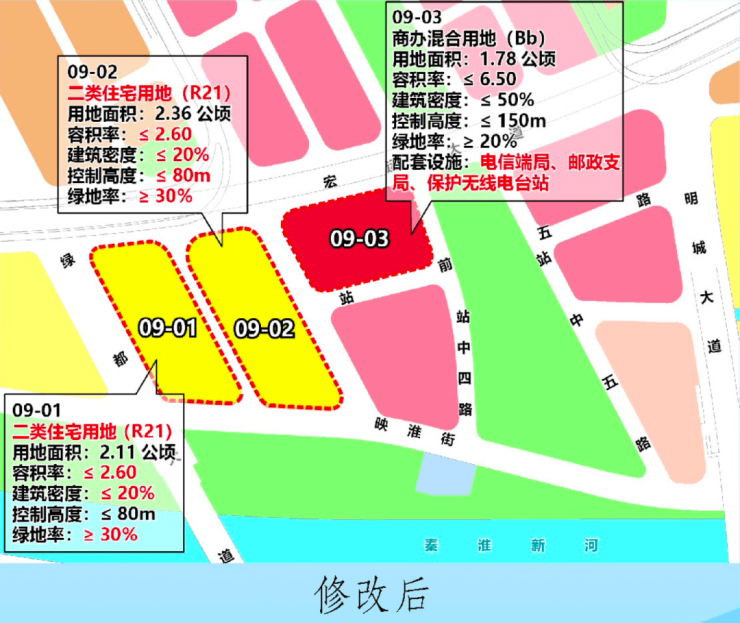 将09-01、02地块规划用地性质由商住混合用地(Rb) 调整为二类住宅用地 (R21),用地面积不变。