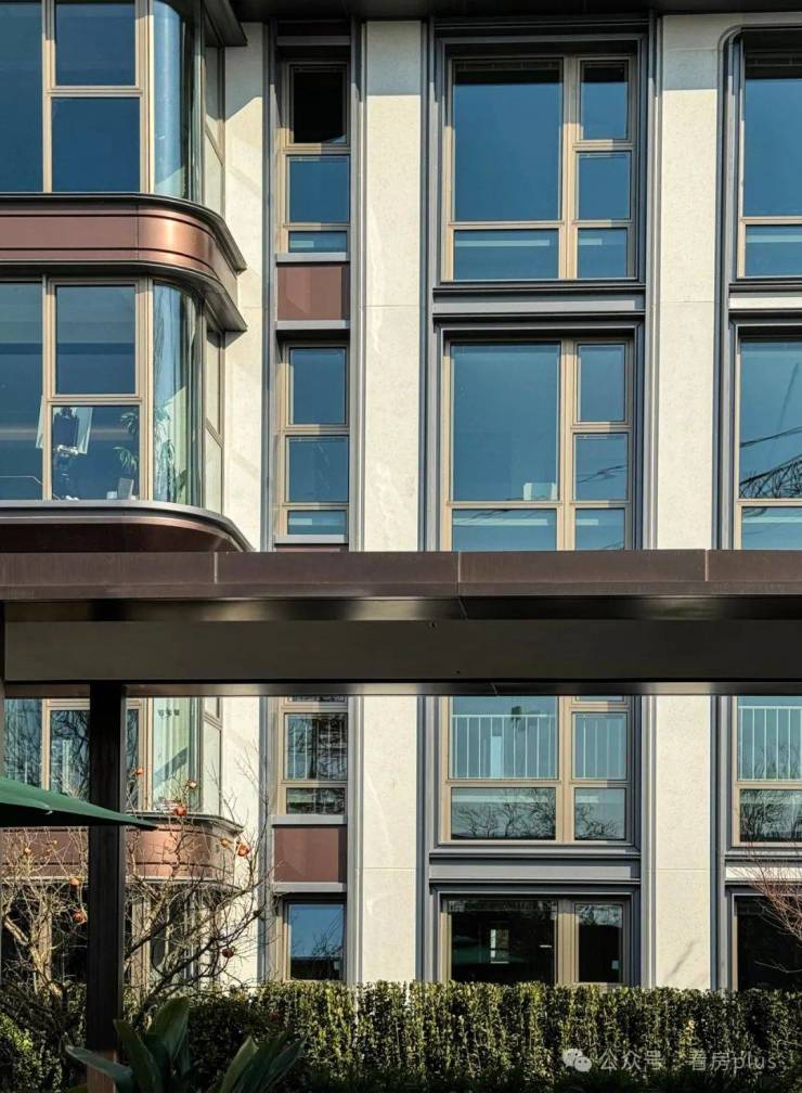 在外立面上,源尚丹若府的南向窗墙比只有约0.49,运用深灰色石材、灰色干挂铝板以及金属格栅,搭配古铜色、铝色、白色线条,打造流畅的曲线外立面,颜值非常高。