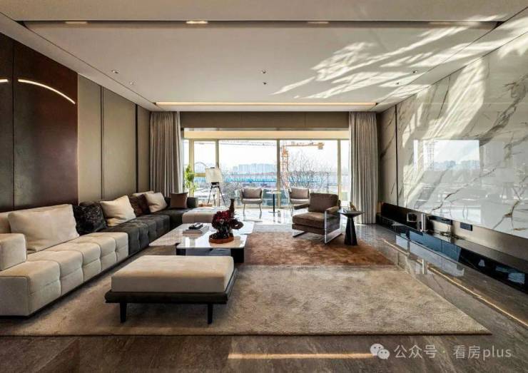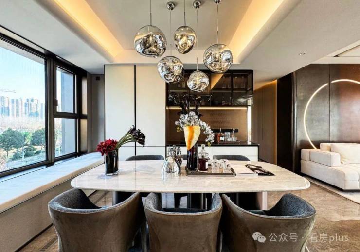 此外还有一些细节,比如客厅吊顶采用弧形圈顶,玄关柜与电视背景墙连接处的岩板也是弧形工艺,卧室除背景墙外的部分墙面采用仿鳄鱼皮软包,窗套垭口不锈钢包边等等......
