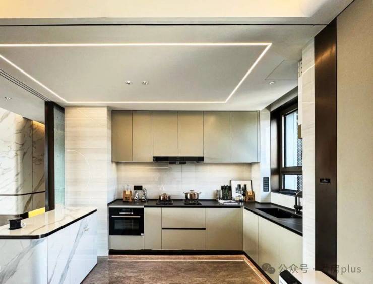中西双厨设计,配置隐藏式吊轨折叠移门,与大餐厅相对独立,重点是引入了整个华东地区都十分罕见的可旋转岛台设计,与厨房的电动折叠门相得益彰。