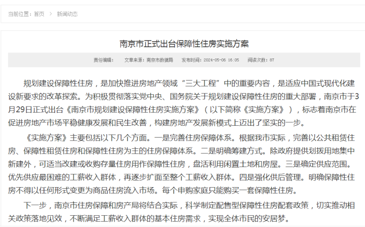 近日,南京市正式出台《南京市规划建设保障性住房实施方案》。