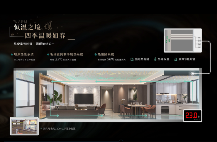 不同于市面上伪六恒科技系统,室内主要由地源、风机盘管、新风系统和地暖组成,存在温度不均匀、垂直温差大、噪音大、需用户自行维修保养等问题,南宸紫阙真六恒科技系统经国际WELL建筑标准金级认证,室内“恒温、恒湿、恒氧、恒洁、恒静、恒智”恒定舒适环境,且室内无设免维修,不仅缔造健康人居范本,而且美观舒适度更优。