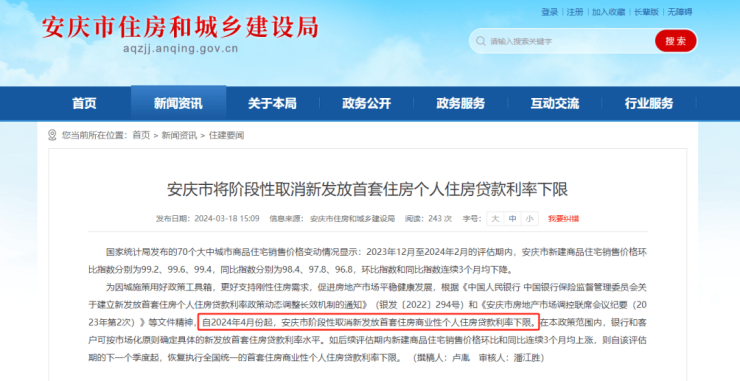 安徽安庆宣布自2024年4月份起,阶段性取消新发放首套住房商业性个人住房贷款利率下限。