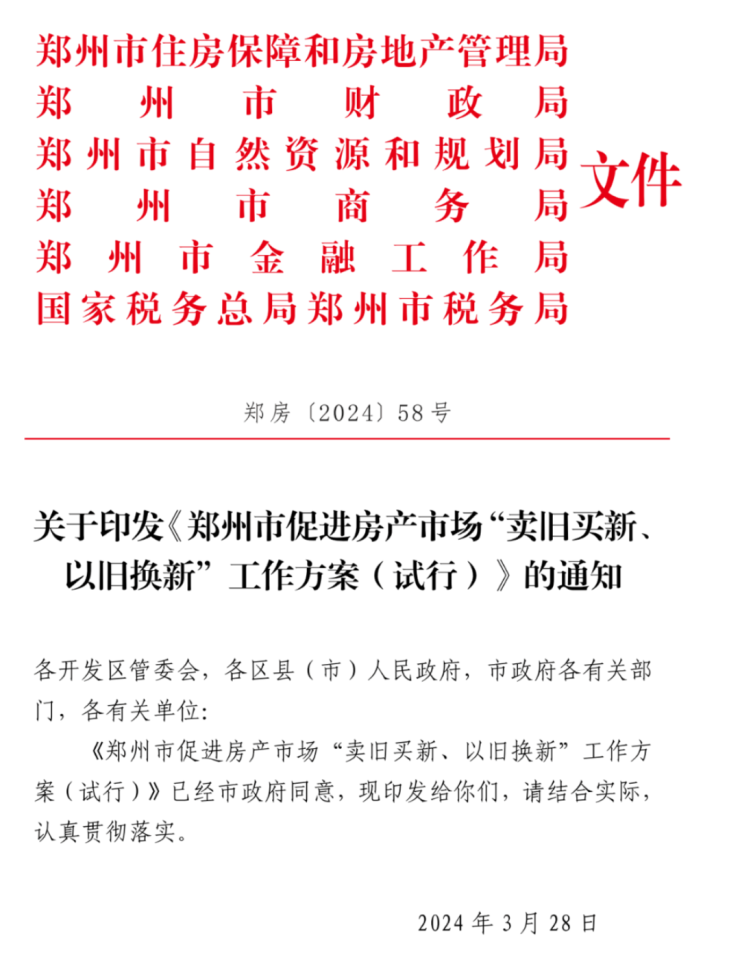 4月1日,郑州市住房保障和房地产管理局、财政局等六部门印发《郑州市促进房产市场“卖旧买新、以旧换新”工作方案(试行)》。根据方案,2024年郑州市计划完成二手住房“卖旧买新、以旧换新”10000套。