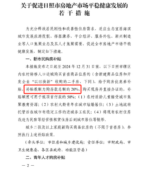 3月25日,山东日照发布楼市新政,针对新市民购房进行返现补贴,补贴金额为总房款的20%,也就是变相给房价打了一个八折。