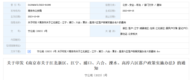 南京市公安局关于印发《南京市关于江北新区、江宁、浦口、六合、溧水、高淳六区落户政策实施办法》的通知(宁公规〔2023〕1号)。