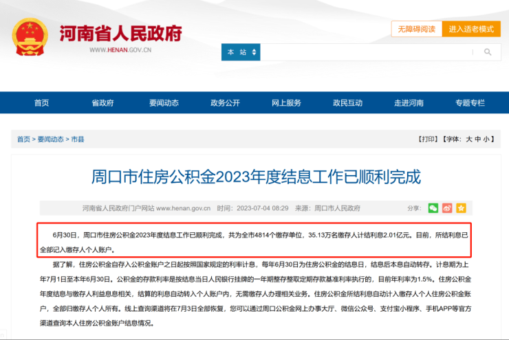 据河南省人民政府官网7月4日消息显示:6月30日,周口市住房公积金2023年度结息工作已顺利完成,共为全市4814个缴存单位,35.13万名缴存人计结利息2.01亿元。目前,所结利息已全部记入缴存人个人账户。