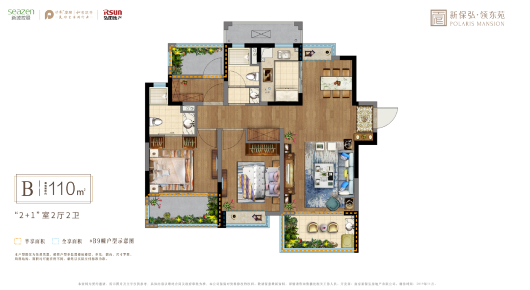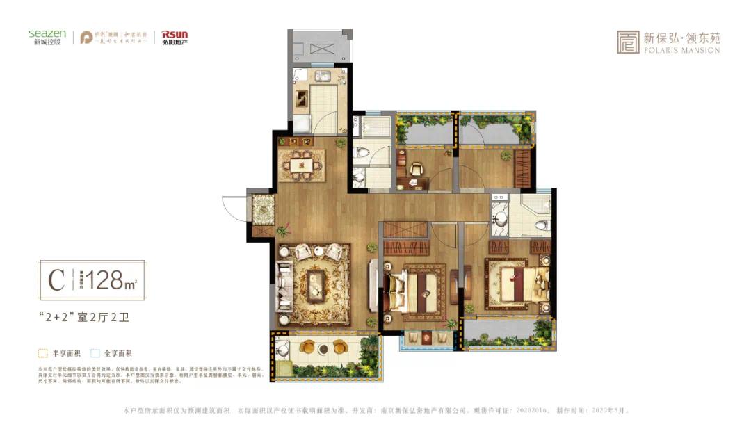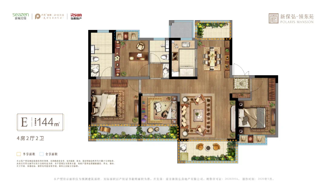 从新保弘领东苑的户型设计来看,项目打造的是建面约89—144㎡户型,均为大面宽、全两卫设计,整个户型相当方正,而且空间感十分通透。