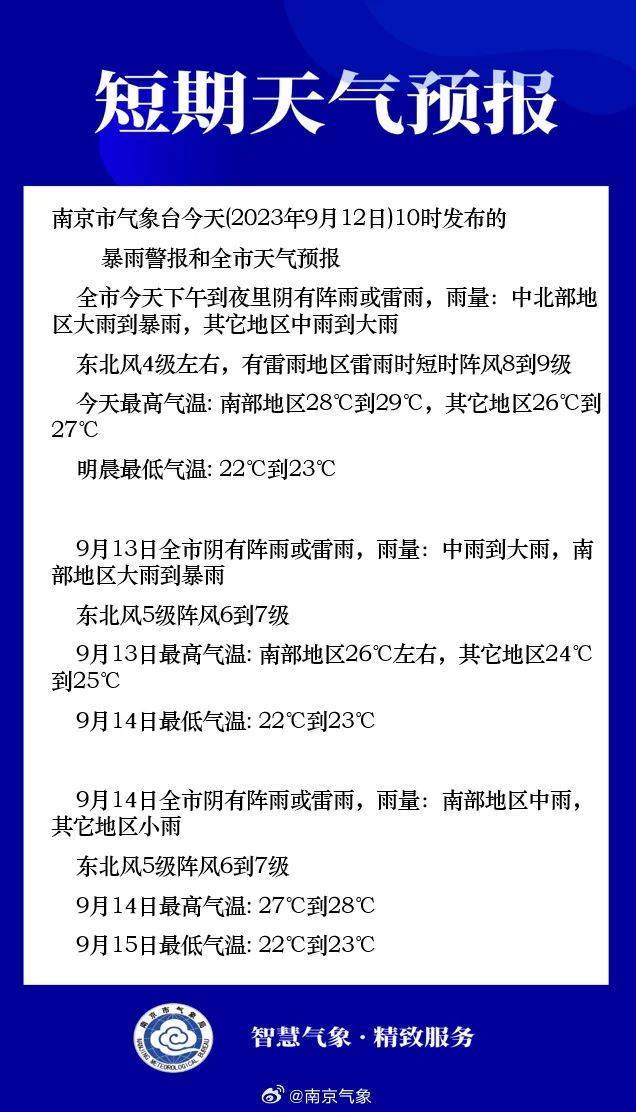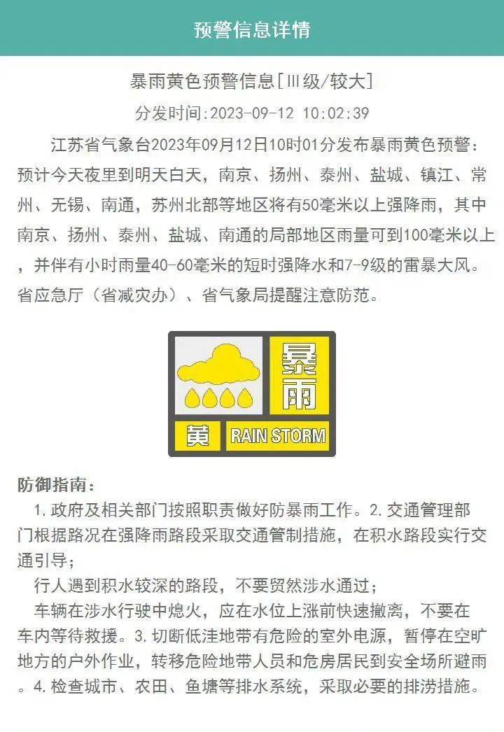 预计今天夜里到明天白天,南京、扬州、泰州、盐城、镇江、常州、无锡、南通,苏州北部等地区将有50毫米以上强降雨,其中南京、扬州、泰州、盐城、南通的局部地区雨量可到100毫米以上,并伴有小时雨量40-60毫米的短时强降水和7-9级的雷暴大风。省应急厅(省减灾办)、省气象局提醒注意防范。
