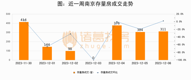 从存量房来看,2023年12月06日南京存量房单日成交311套,比昨日增加7套,环比上涨2.3%。从近一周存量房成交来看,南京存量房日均成交套数为235套,12月06日单日成交311套,高于近一周平均水平32.3%。