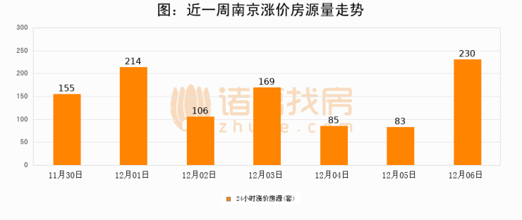 根据诸葛找房数据显示,南京24小时涨价房源量为230套,较12月05日增加147套,环比上涨177.1%。与此同时,涨价房源占比小幅扩大,业主信心有所提升。