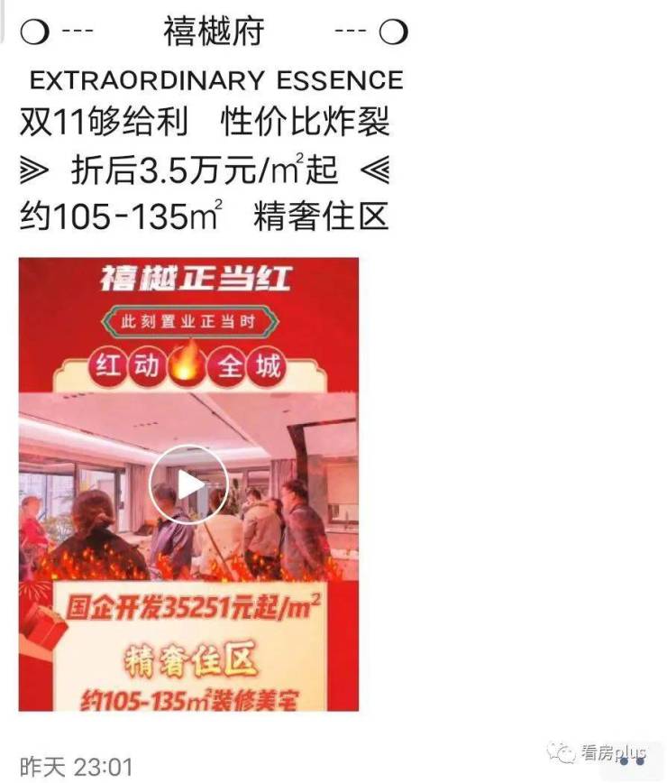据悉项目的销许均价高达45397元/㎡,首开的时候优惠价是3.8-4万/㎡,而现在推出双11特惠季,据销售宣传,在售建面约105-135㎡户型,单价3.5万/㎡起步,小户型总价最低370万,首付74万起。