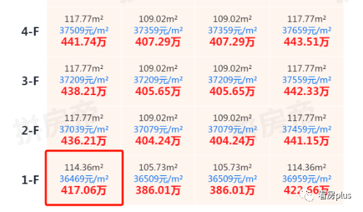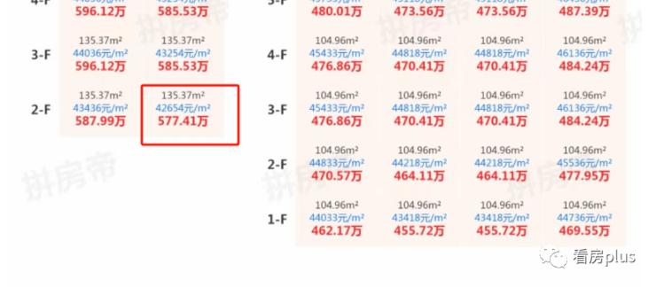 单从一房一价表上来看,这次的房源均价最便宜的一套1楼房源,单价也要3.6万+,相比29600元/㎡的价格,每平也差了6000多。