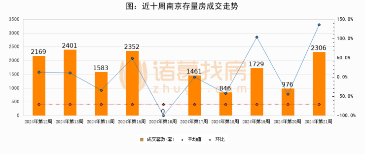 存量房方面,第21周南京存量房成交2306套,较上周增加1330套,环比上涨136.3%。从近十周成交走势来看,周均成交套数为1582套,本周高于平均水平45.8%。