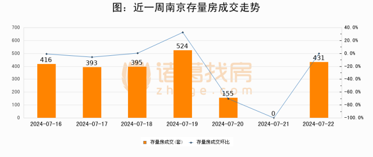 从存量房来看,2024年07月22日南京存量房单日成交431套,比昨日增加431套,环比上涨0%。从近一周存量房成交来看,南京存量房日均成交套数为330套,07月22日单日成交431套,高于近一周平均水平30.6%。