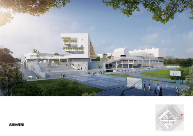 项目位于泰山街道,新建4轨24班小学,总建筑面积3.2万平方米,主要包括教学楼、行政楼、报告厅、风雨操场、景观内院、室外活动场地等。