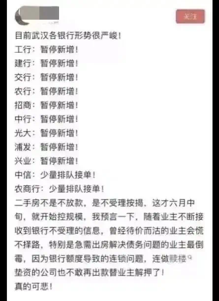 另一边,武汉“多家银行被爆暂停房贷”的消息被传得沸沸扬扬,房贷环境严峻!