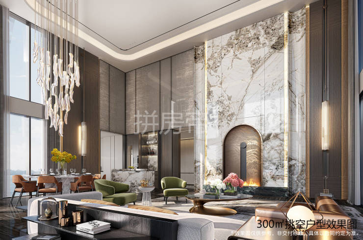 中海非常有创意的把两种挑空户型错位叠加,奇数层为300㎡的边厅挑空,偶数层为270㎡的南厅挑空,像俄罗斯方块一样,餐客厅挑高约6.6米。