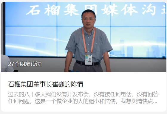 昨日晚上,崔巍再次强调,“我现在正在努力的稳定和推动石榴集团正常可持续的经营,我恳请你不要‘破罐子破摔’,再继续杜撰、编造更多的负面舆论,挑动舆论场,毁败石榴集团。我也恳请所有与石榴集团相关的业务友好,能看清这个事实,能理解石榴集团的处境”。